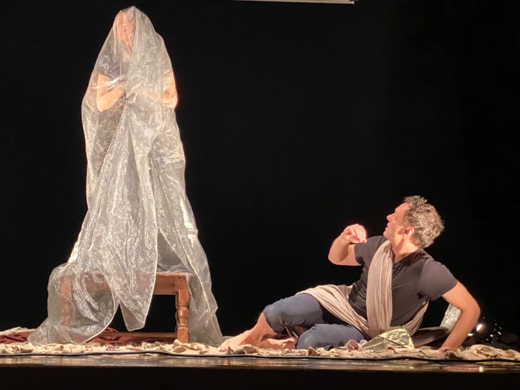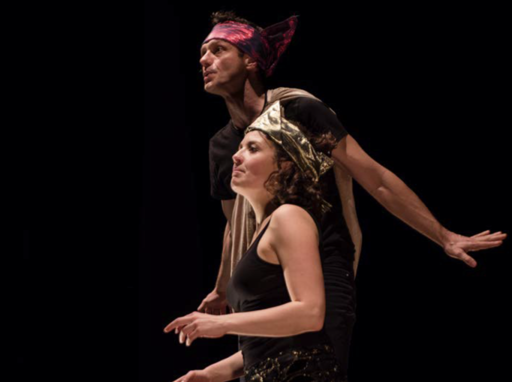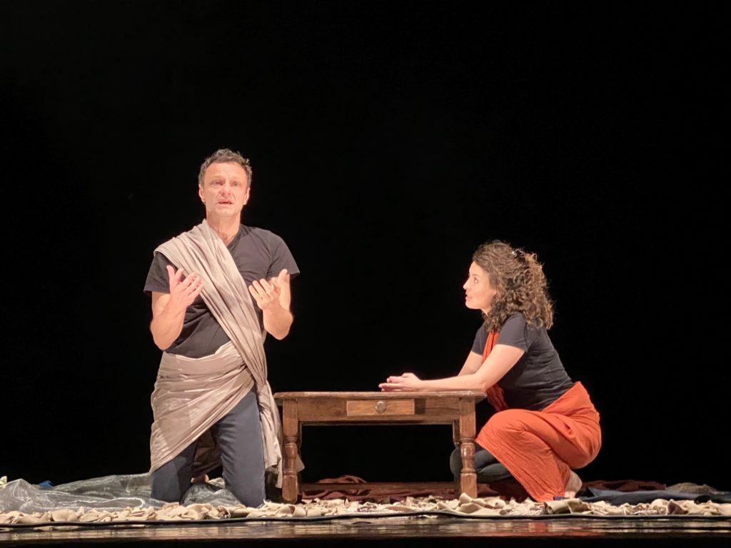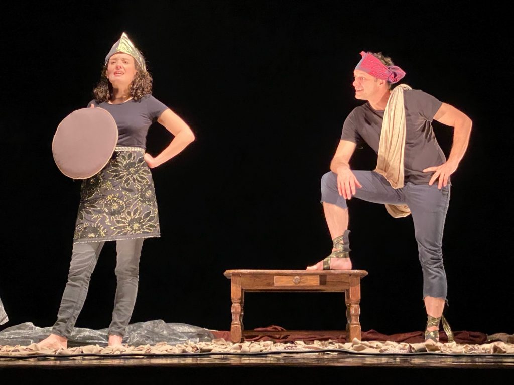 Sur un simple tapis de tissus, deux comédiens jouent tous les personnages, dans un jeu vif, direct, au plus près du public.