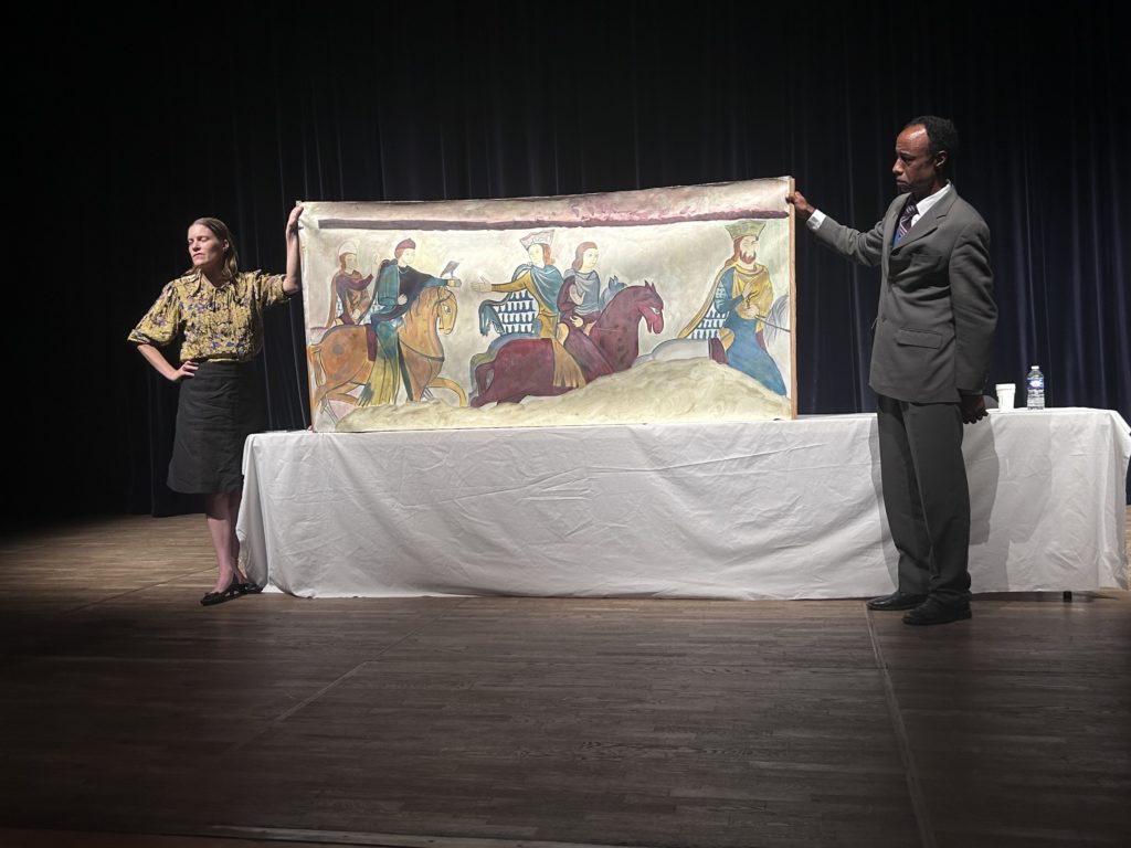 Oui, elle est désormais un personnage qui dépasse largement l’histoire du Moyen Âge, son histoire réelle étant remplie de zones d’ombre. Il y a toute une dimension fantasmagorique autour d’elle, un mélange entre vrai et faux qui conduit à la création du mythe. J’étais intéressé par ce passage de la réalité au mythe. C’est aussi ces passages qui sont mis en jeu par nos conférenciers.