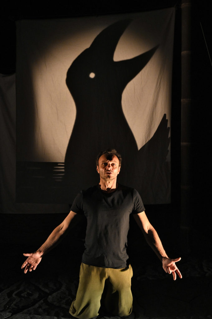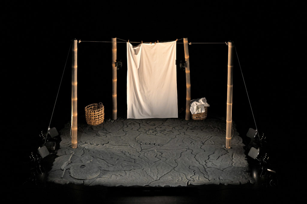 Dans notre scénographie, Ulysse s’occupe à étendre le linge brodé de Calypso sur le promontoire où il a coutume de fuir le lit de la nymphe. Les ombres des plaques minérales ramassées au sol sont projetées sur ces linges suspendus comme autant de voiles hissées au bord de la mer, pour reconstituer des scènes de théâtre d’ombres éphémères. Ainsi au premier plan se joue la relation entre les 3 personnages : Hermès, Calypso et Ulysse, sous la forme d’un huis clos.